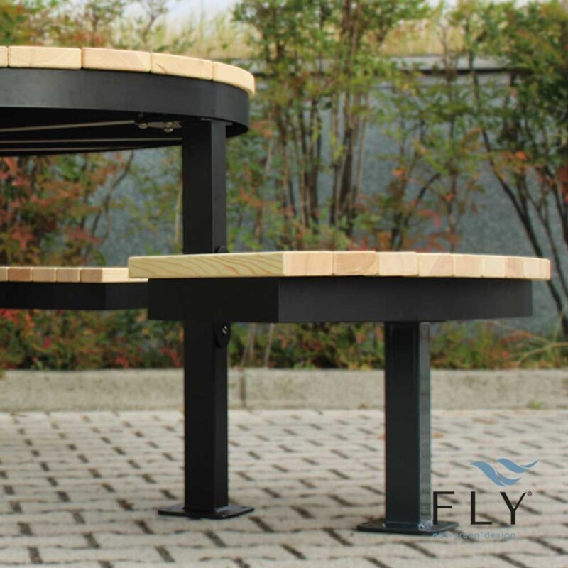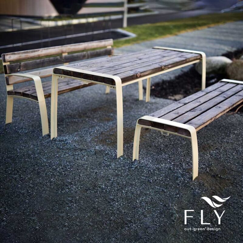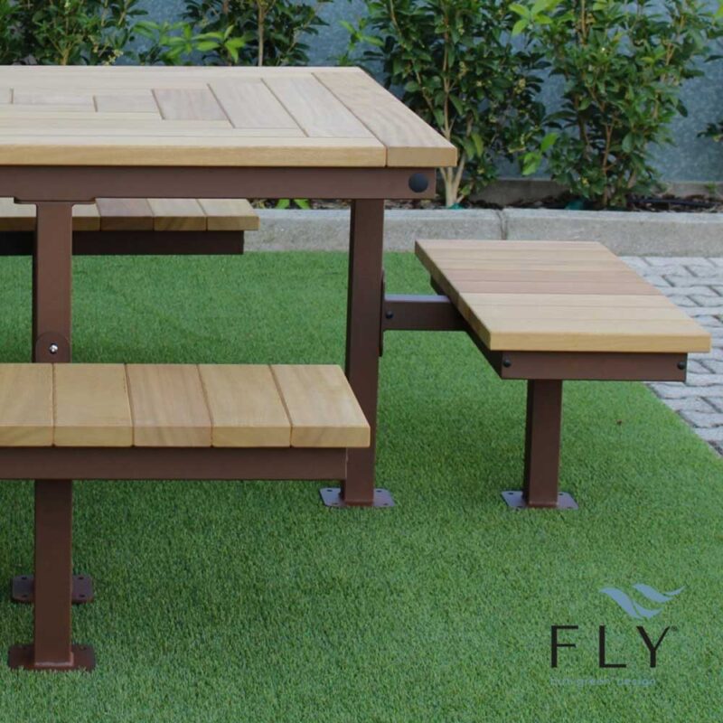 Oppure con struttura in acciaio e legno trattato per esterni. Oppure realizzato completamente in legno. Possono essere con tavolo e panchine attaccate tra loro a creare un unico blocco o con panchine staccate dal tavolo.