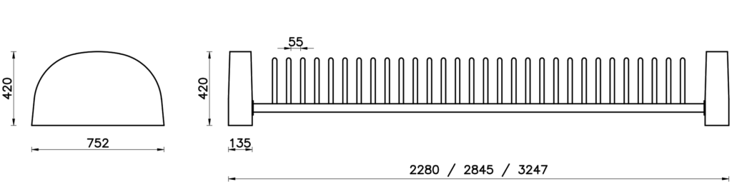 Alfa bike rack made galvanized and powder coated steel in different RAL colours with concrete rounded sides.