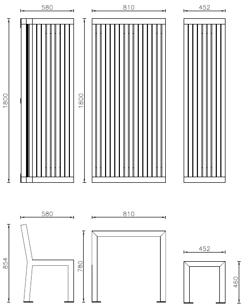 Set made by galvanized and powder coated steel structure in different RAL colours with slats in pinewood or hardwood.