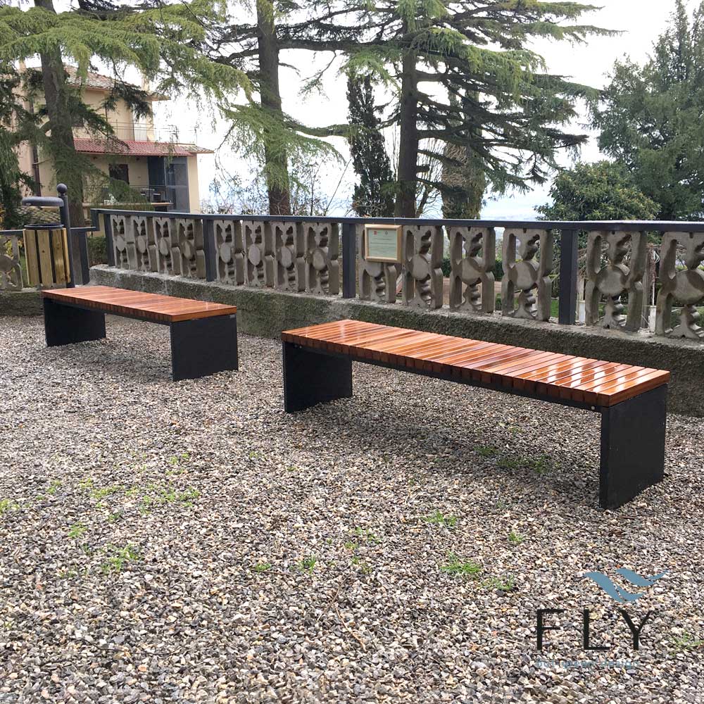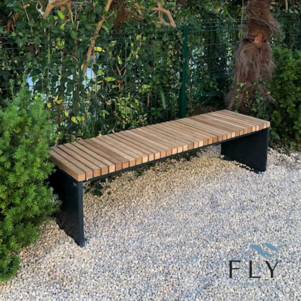 Bench in galvanized and powder coated steel structure, wood slats in hardwood or pinewood.