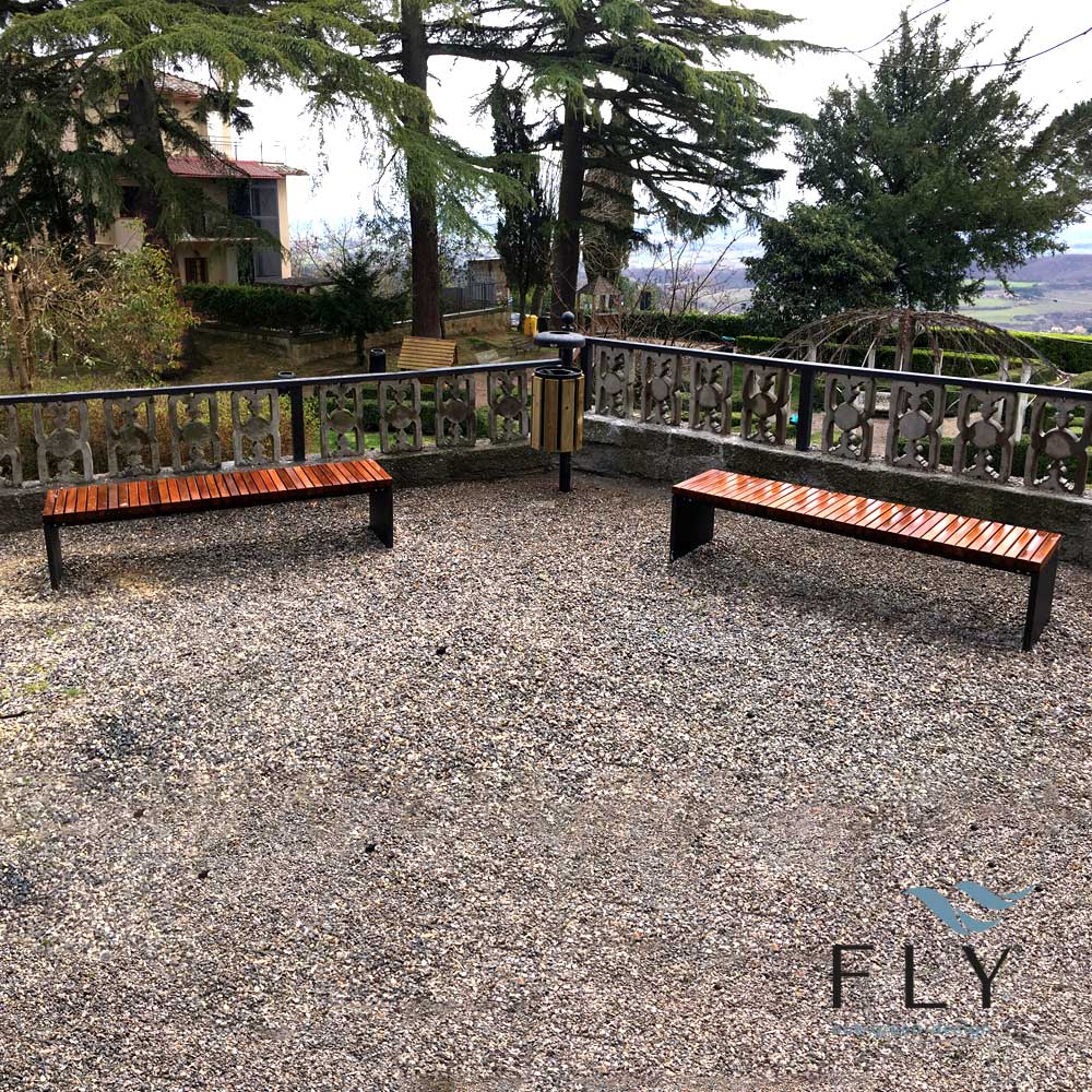 Bench with backrest with an elegant design, galvanized and powder coating steel structure, pinewood or hardwood sitting.