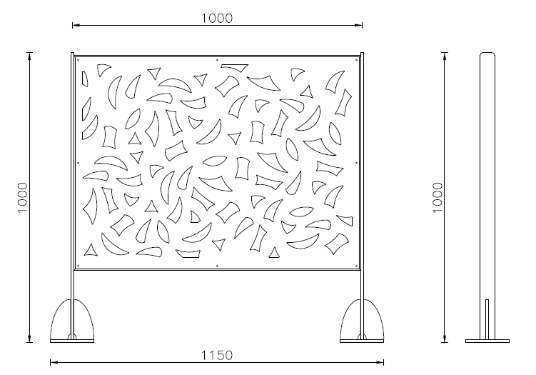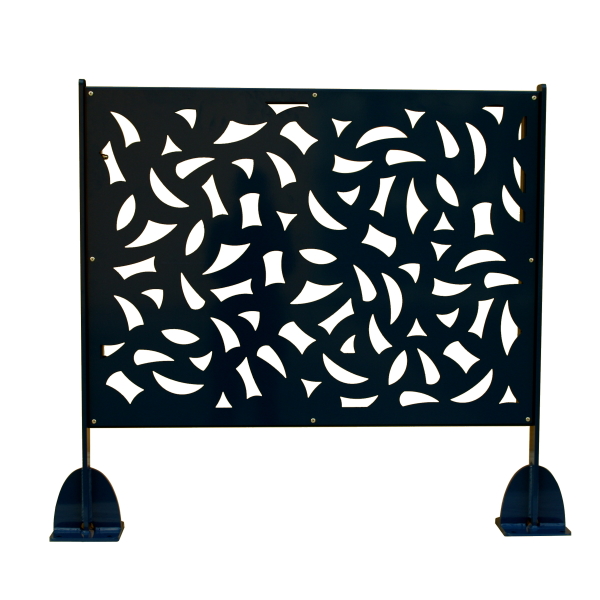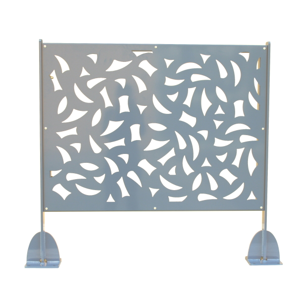 Modular barrier made by 2 supports, to which a decorative panel is fixed. The decorative panel consists of a laser-cut steel panel fixed to the frame.