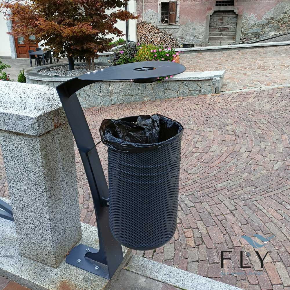 Round shaped bin made of bent and welded steel sheet with a laser-cut design. On top can be equipped with removable ashtray. The bin is equipped with inner liner made of galvanized steel.