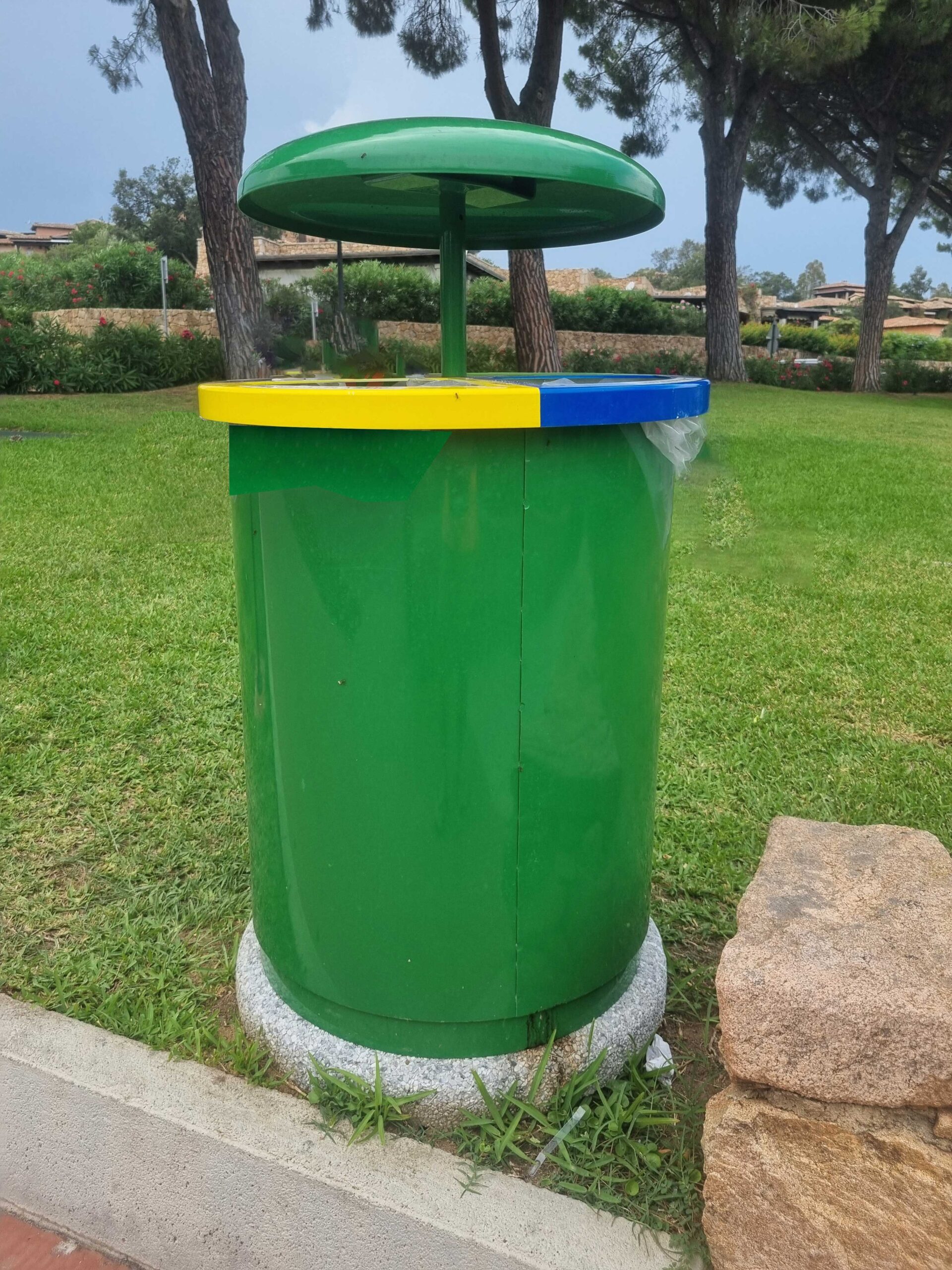 Cylindrical structure made of smooth steel sheet, laying on a steel base. Each sector is identified by a coloured label on the top for separate waste. Internally divided into 3 sectors; each sector is equipped with a steel sack-holder ring.