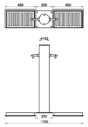 Fountain Trieste double is made of a round steel structure, closed on top by a steel cap fixed with two screws, so that it can be easily removed for installation and maintenance operations on the tap. The bottom part is provided with a square flange for ground anchoring with bolts. The nickels-plated brass tap are front-button type with return spring. The drains is made in coated steel and consists of two parts: a frame to be inground mounted (or fixed on top of a water trap) and a removable grille for easy cleaning.