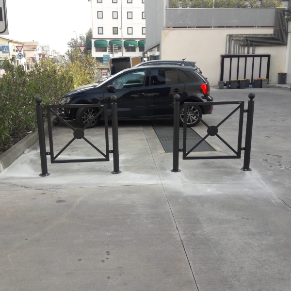 Modular barrier made by 2 tubular steel supports, closed on top with bosses and forged steel spheres. The central panel is made of a perimetral frame with a cross and central disk, and is fixed to the supports by bolts. The barrier can be supplied in modular or in single version (as in picture).