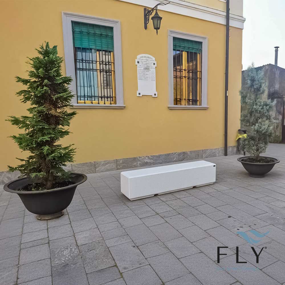Planter made in reinforced concrete. The mixture is composed of white cement 525, white marble grit, white marble powder, compacting and fluidifying additives to reduce the percentage of water; the mixture is finally poured in formworks. Waterproof interior and equipped with hooks for movement.