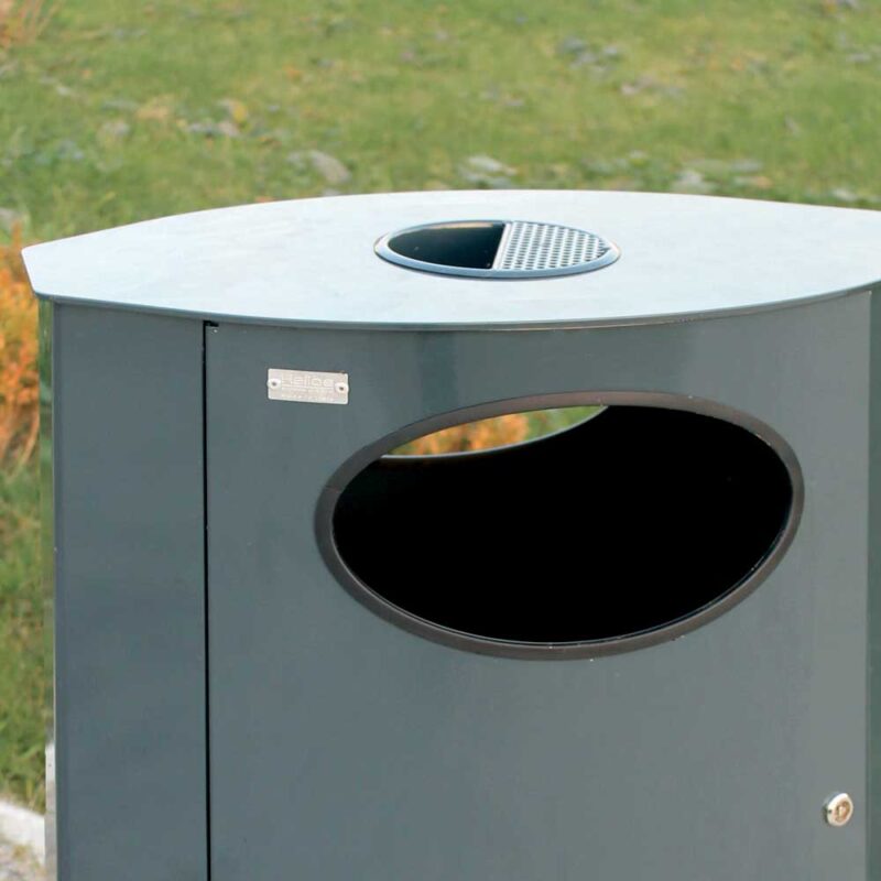 Elliptical-shaped bin made of steel sheet. Lid equipped with a removable ashtray. Provided with sack ring holder made of stainless steel.