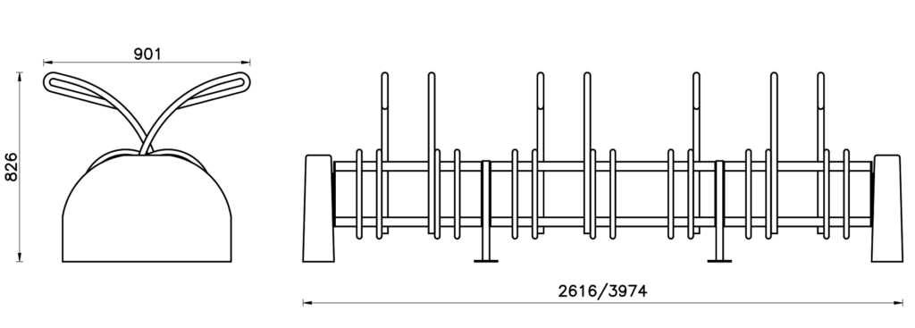Strike CLS bike rack made galvanized and powder coated steel in different RAL colours with concrete rounded sides.