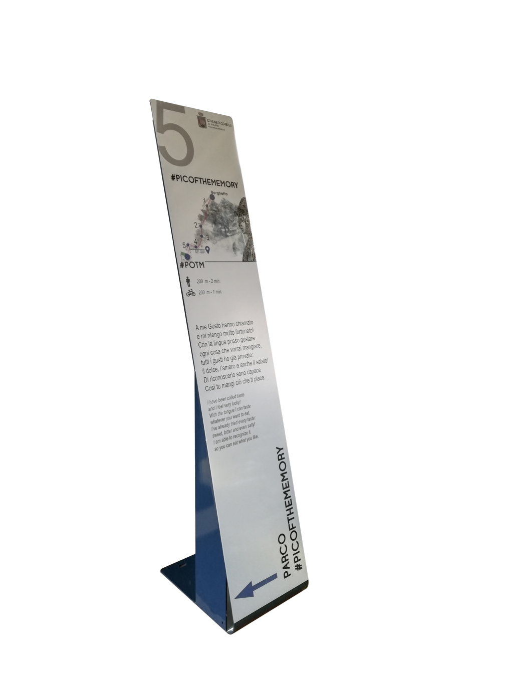 Double-sided totem composed by a frame and two display panels. The frame is made of rectangular tube section with a laser-cut plate at the base, with holes for ground anchoring with bolts. The display panels are made of 20/10 mm thick steel sheet, suitably folded and then fixed with screws to the side, top and bottom of the frame.