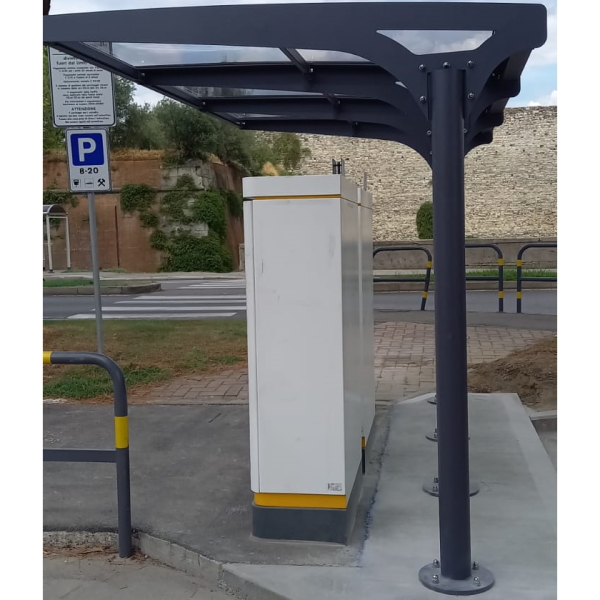 Su richiesta dell’ente è stata fornita senza parete di fondo e con la copertura in policarbonato , ma può essere realizzata anche con le pareti di fondo e con quelle laterali. Si può inoltre richiedere l’aggiunta di una bacheca laterale e di una seduta in acciaio inox, in legno o in acciaio zincato e verniciato