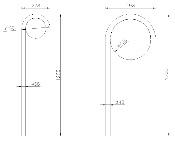 Archetto per passo carraio, modello B. Archetto realizzato mediante piegatura a freddo di tubolare in acciaio Ø 38 mm a forma di U rovesciato, con saldate un disco Ø 200 mm. È fornito da inghisare. Verniciato a polveri poliestere termoindurenti. Completo di pellicola monofacciale.