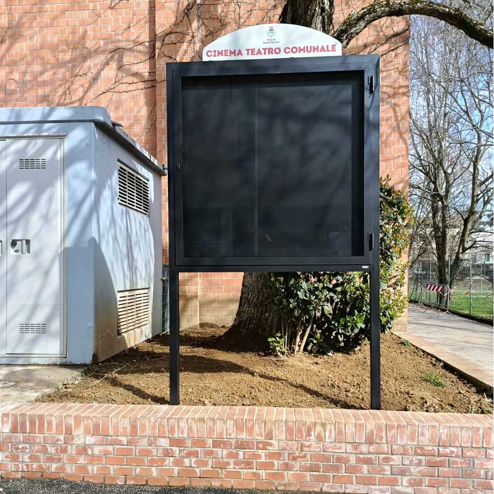 Bacheca Asti con anta in vetro, dimensioni espositive di 1300×1300 mm. Prodotto da inghisare al terreno e realizzato in acciaio zincato e verniciato.