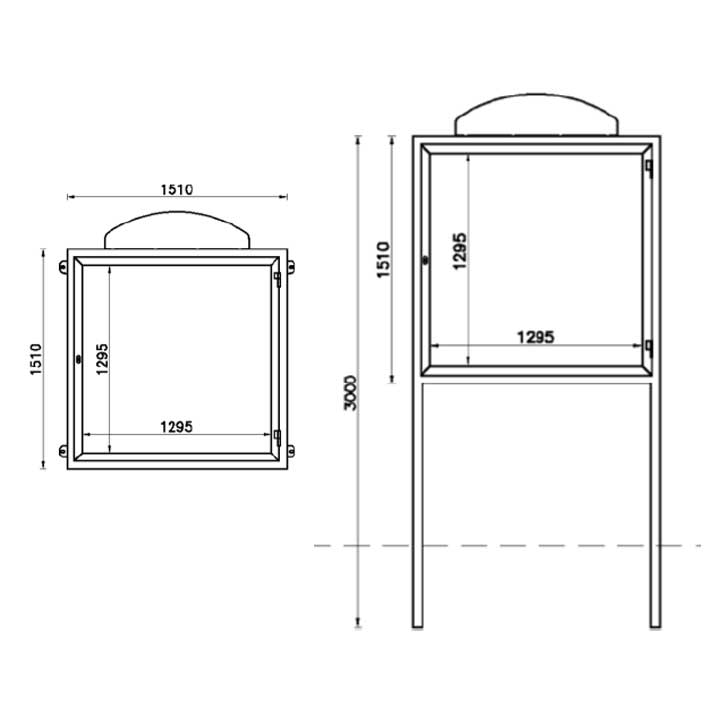 Bacheca Asti con anta in vetro, dimensioni espositive di 1300×1300 mm. Prodotto da inghisare al terreno e realizzato in acciaio zincato e verniciato.
