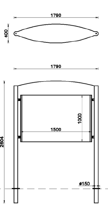 Bacheca Poster da esterno, bifacciale è composta da due 2 colonne portanti in acciaio da inghisare, con piastre decorative. Il telaio centrale è costituito da tubolare in ferro al quale viene rivettata una lamiera che servirà da base per l’affissione di manifesti. La versione standard è con pannello bombato, ma a richiesta può essere fornita con pannello semplice. Il pannello espositivo ha dimensioni da 1000×1000 mm. Il coperchio, ricavato da taglio laser, è sagomato e fissato ai supporti tramite delle viti. Tutte le parti metalliche sono zincate e verniciate a polveri poliestere termoindurenti. La viteria è in acciaio inox.