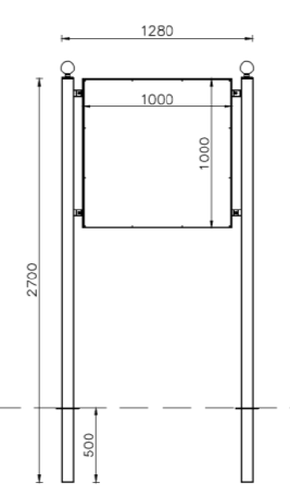 Bacheca Stendardo da esterno monofacciale è composta da due 2 colonne portanti in tubolare d’acciaio con borchia e sfera decorativa di testa in acciaio forgiato e flangia alla base. Il telaio centrale è costituito da tubolare in ferro a sezione quadra al quale viene rivettata una lamiera di alluminio che servirà da base per l’affissione di manifesti. Il pannello espositivo ha dimensione 1000×1000 mm. Tutte le parti metalliche sono zincate e verniciate a polveri poliestere termoindurenti. La viteria è in acciaio inox. La bacheca è fornita con supporti da inghisare e con piastre con funzione di decoro a copertura del cemento e indicazione della parte da cementare.