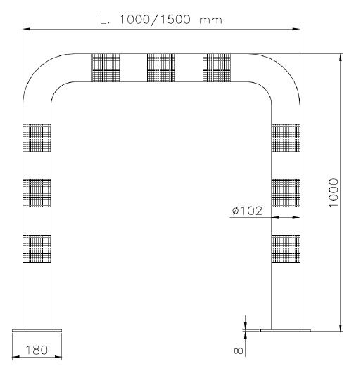 Barriera di protezione con lunghezza 1000 mm ha alta resistenza agli urti e viene realizzata in tubo tondo Ø 102 mm. La protezione è provvista di piastre in acciaio forate alla base per il fissaggio a terra tramite tasselli. Le parti in acciaio sono verniciate a polveri termoindurenti rispondenti alle più severe prove qualitative. La protezione è completa di fasce rifrangenti H.10 cm, classe I.