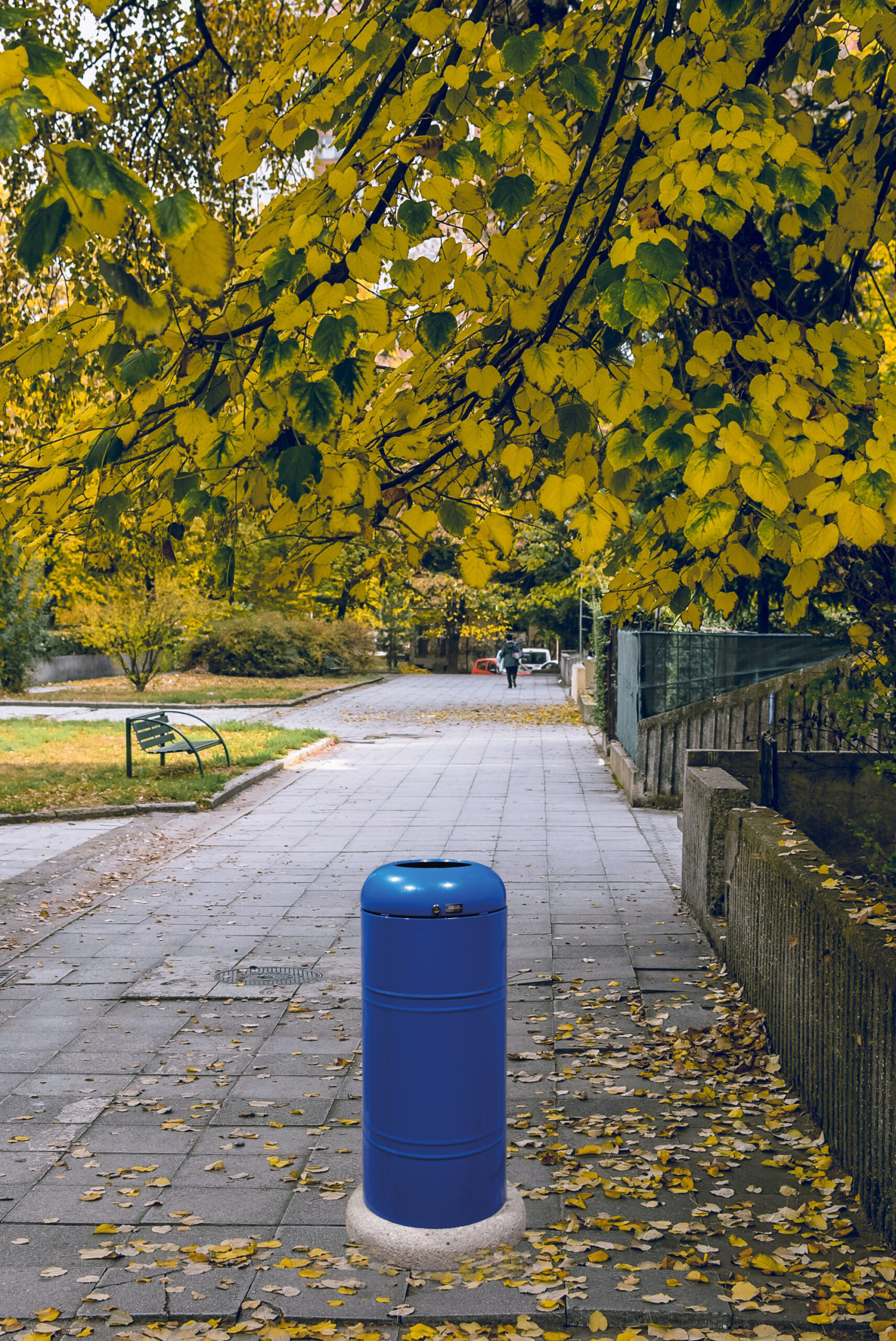 Cestino di forma cilindrica realizzato in acciaio zincato e verniciato con foro per l’introduzione dei rifiuti nella parte superiore del coperchio. Completo di contenitore interno. Con base in cemento.