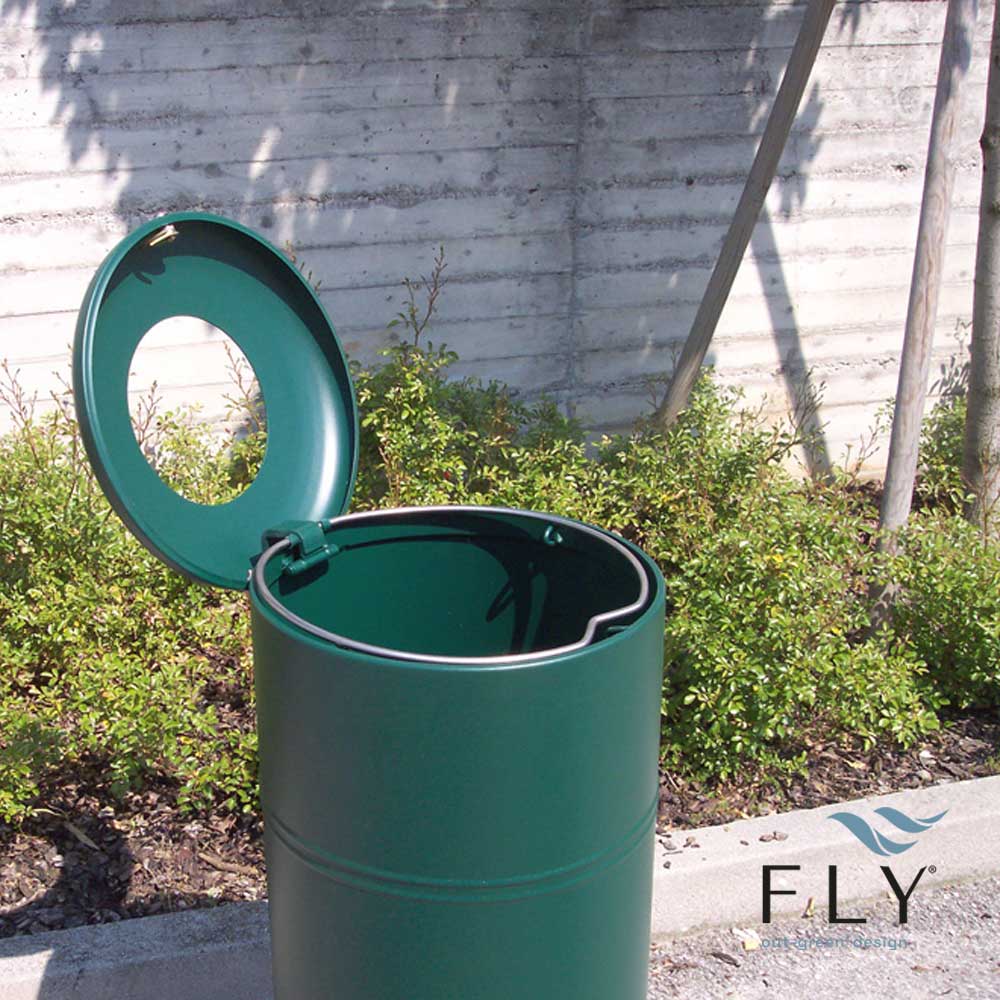 Cestino Apollo è un cestino a forma cilindrica con nervature costituito interamente in lamiera zincata e verniciata a polveri poliestere termoindurenti disponibili in diverse colorazioni. Con anello di irrigidimento superiore ed inferiore in piatto di acciaio calandrato che garantisce stabilità e indeformabilità. Il coperchio di forma circolare è forato al centro per l’introduzione dei rifiuti e al suo interno è presente un contenitore interno dove poter posizionare il sacchetto. Il coperchio è fissato al cilindro con una robusta cerniera ed è dotato di serratura universale apribile. La base di appoggio del cestino è in cemento colore bianco di forma cilindrica oppure in ferro zincato e verniciato. La viteria è in acciaio inox.