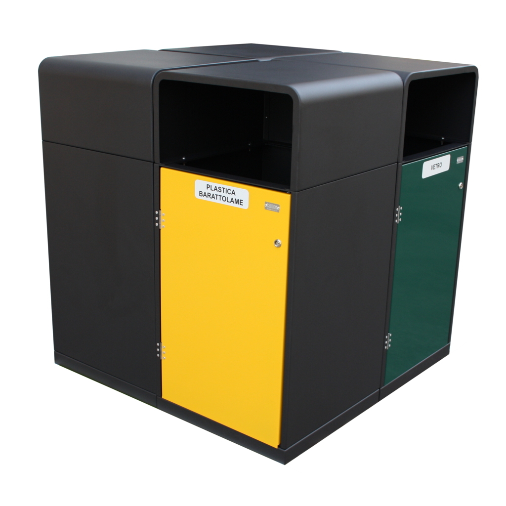 Completo di scritte identificative della raccolta differenziata. L’anta di ogni contenitore viene verniciata del colore relativo alla raccolta come indicato nella foto (colori a norma UNI).