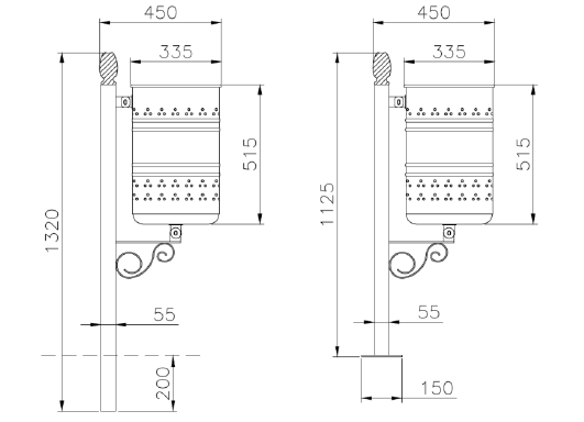 Tutte le parti metalliche sono zincate e verniciate a polveri poliestere termoindurenti disponibili in diverse colorazioni RAL. Particolarmente adatto ai centri storici o borghi medioevali.