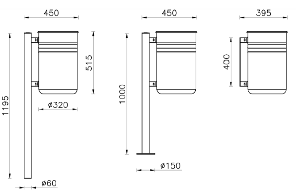 Cestino realizzato in acciaio zincato e verniciato, con contenitore di forma cilindrica. Il paletto è dotato di piastra base per il fissaggio al suolo con tasselli, ma è possibile anche inghisare il paletto oppure fissare il cestino a muro. Completo di anello reggisacco.
