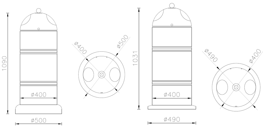 | Dimensioni | Fusto Ø 400 mm – Base in CLS Ø 500 mm – Base in ferro Ø 490 mm |