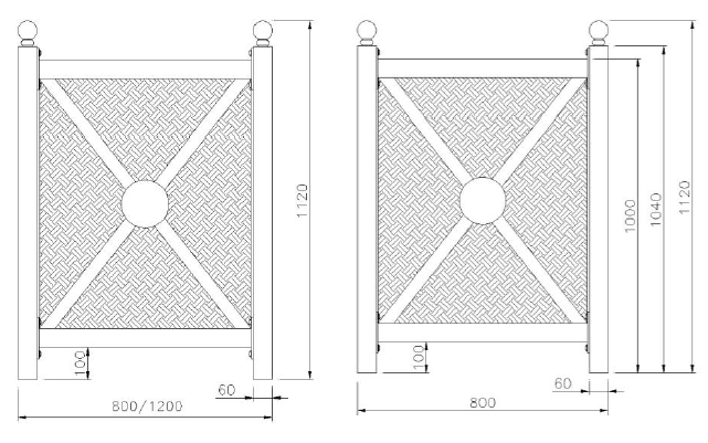 Fioriera Alba 800 x 1200 mm. Fioriera composta da una struttura portante in tubolare quadro di acciaio con sovrastanti borchie e sfere in acciaio forgiato. Pannellatura realizzata da telaio perimetrale in tubolare quadro e crociera in piatto, con nodo centrale in tondo pieno. Tutte le parti metalliche sono zincate e verniciate a polveri poliestere termoindurenti. Elementi strutturali collegati tramite staffe in acciaio e viteria in acciaio inox che permettono di realizzare una solida unione tra gli elementi e di ottimizzare eventuali interventi di manutenzione. Vasca interna in lamiera di alluminio mandorlata con elementi in angolare d’acciaio come rinforzi interni dotata di fori di scolo per l’eliminazione dell’eccesso d’acqua.