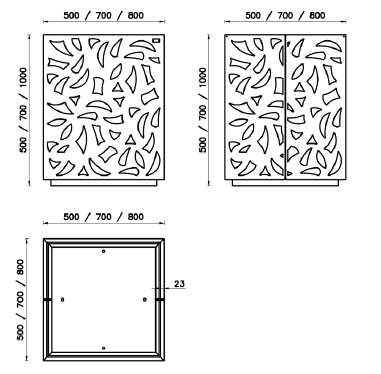 Fioriera Quadra con decori Doha di dimensioni 500x500x500 mm. La fioriera Doha è composta da una struttura esterna e, su richiesta, da un contenitore interno, entrambi realizzati completamente in acciaio. La struttura è realizzata in lamiera piegata e con fondo forato per lo scolo delle acque superflue e piovane. Nei lati sono presenti delle decorazioni ricavate durante il taglio laser della lamiera. Il fondo, anch’esso in lamiera, è saldato alle pareti e ha nella parte inferiore un telaio saldato fatto con piatto, che serve a sollevarlo da terra. Il contenitore interno è anch’esso realizzato in lamiera piegata e forata nel fondo per lo scolo delle acque in eccesso. Tutte le parti metalliche sono zincate e verniciate a polveri poliestere termoindurenti secondo le colorazioni RAL. Dotata di fori di scolo per l’eliminazione dell’eccesso d’acqua.