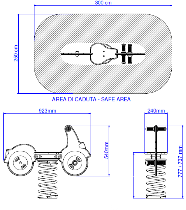 Gioco a molla con sagoma a forma Moto composto dalla sagoma realizzata interamente in polietilene PE-HD colorato in massa. Il polietilene è trattato contro i raggi UV. Il gruppo molla è testato e certificato ed è ancorato alle estremità. La staffa a U brevettata in nylon colorata in massa fissata allo sping-disk garantisce la perfetta unione e tenuta tra gruppo molla e la sagoma del gioco. Il supporto di fissaggio a terra è dato da una robusta intelaiatura in acciaio successivamente zincata a caldo a garanzia di una forte resistenza contro la corrosione, interrata e fissata allo sping-disk garantisce l’ancoraggio dell’ intero gioco al terreno. La ferramenta utilizzata per montare il gioco a molla è in acciaio inox e acciaio zincato.
