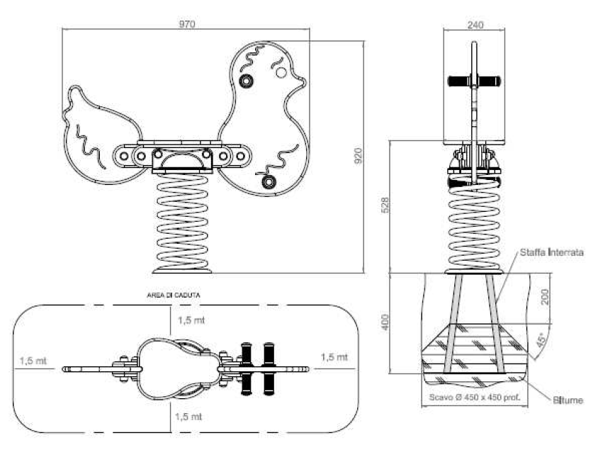 Gioco a molla con sagoma Pulcino è composto da una sagoma realizzata interamente in polietilene PE-HD e colorato in massa. Il polietilene è trattato contro i raggi UV. Il gruppo molla è testato e certificato ed è ancorato alle estremità. La staffa a U, brevettata in nylon colorata in massa fissata allo sping-disk, garantisce la perfetta unione e tenuta tra gruppo molla e la sagoma del gioco. Il supporto di fissaggio a terra è dato da una robusta intelaiatura in acciaio successivamente zincata a caldo a garanzia di una forte resistenza contro la corrosione, interrata e fissata allo sping-disk garantisce l’ancoraggio dell’ intero gioco al terreno. La ferramenta utilizzata per montare il gioco a molla è in acciaio inox e acciaio zincato.