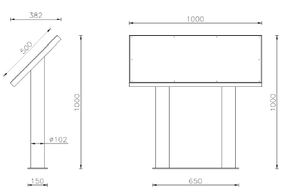 Leggio Book da tassellare è composto da due supporti in tubo tondo e saldati al sovrastante telaio in tubo quadro. Le scritte (su richiesta) possono essere serigrafate sul pannello e applicate al leggio. Il leggio è fornito con piastra forata e saldata alla base per il tassellamento al suolo. Tutte le parti metalliche sono zincate e verniciate a polveri poliestere termoindurenti. La viteria è in acciaio inox.