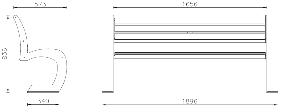 Panchina in acciaio e legno costituita da due robuste spalle laterali in acciaio, le basi di forma semicircolare sono predisposte per poter fissare la panchina al suolo con tasselli ad espansione. Seduta formata da tubolari in acciaio e doghe di legno in pino nordico, trattate con preservante in autoclave, oppure in legno di pregio fissate su tre supporti, uno centrale e due laterali. Lo schienale ha le stesse caratteristiche della seduta con doghe di legno. Seduta e schienale sono fissati alle spalle tramite viti. Le parti metalliche sono zincate e verniciate a polveri poliestere termoindurenti nelle diverse colorazioni RAL. La viteria è in acciaio inox.