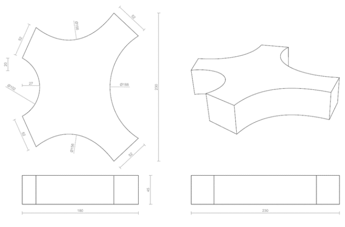 Panchina Sophie monoblocco in graniglia di marmo dal design particolare a 4 punte. Possibile realizzare composizioni a piacimento.