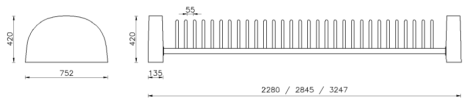 Portabici Alfa con rastrelliera costituita da elementi in tubolare tondo di acciaio opportunamente curvati e rigidamente saldati a due tubolari orizzontali tondi in acciaio. I fianchi laterali di sostegno sono in graniglia di marmo di forma arrotondata. Tutte le parti metalliche sono zincate e verniciate a polveri poliestere termoindurenti nelle diverse colorazioni RAL.