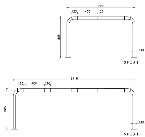 Portamonopattini Jambo tre posti . Realizzato con elemento portante in tubolare sagomato ad arco a cui sono saldate delle flange che fungono da appoggio per manubrio delle biciclette o dei monopattini da assicurare.