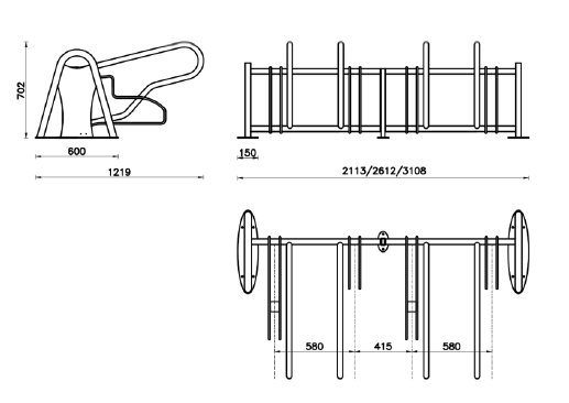 Il portabici Recoaro è pensato per aree ad alta affluenza, dove è necessario fissare le biciclette in modo sicuro alla rastrelliera. È composto da reggi-ruota sfalsati in altezza, realizzati in tondino sagomato, affiancati da archetti in tubolare che permettono di bloccare le bici direttamente al telaio. Le estremità del portabici sono fissate a due archetti laterali in tubolare, ciascuno saldato a una piastra ellittica predisposta con fori per l’ancoraggio al suolo tramite tasselli ad espansione. Tutte le parti metalliche sono zincate e verniciate a polveri poliestere termoindurenti. La viteria è in acciaio inox.