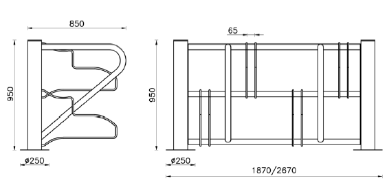 Portabici Rotterdam costituito da elementi reggi-ruota alternati in altezza realizzati in tondino ed opportunamente sagomati. Ad ogni reggi-ruota è affiancato un archetto realizzato in tubolare, che ha la funzione di fissare le bici direttamente al telaio. Le estremità del portabici sono fissate tramite viti, con saldata alla base una piastra tonda per l’appoggio al suolo e predisposta di fori per il fissaggio a terra tramite tasselli ad espansione. Tutte le parti metalliche sono zincate e verniciate a polveri poliestere termoindurenti. La viteria è in acciaio inox.