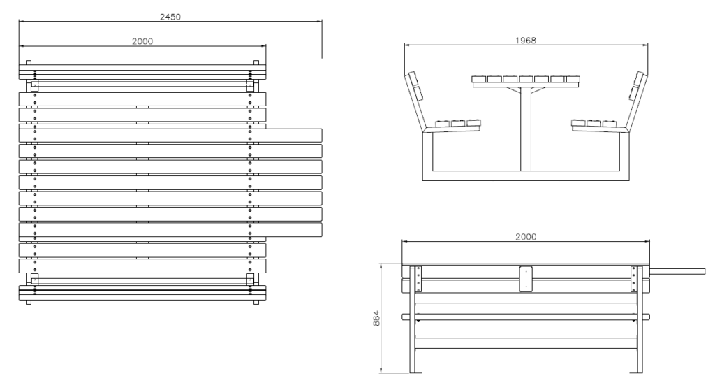 Set Break Point per persone in carrozzina. Set composto da un tavolo e due panchine con schienale. Il set è composto da una struttura in acciaio zincato e successivamente verniciato a polveri epossidiche formata da due supporti laterali in tubolare collegati tra loro da tre tiranti. Ai fianchi vengono saldate 4 piastre con fori per il fissaggio al suolo tramite tasselli. La struttura montata diventa corpo unico per evitare che gli utenti spostino a piacere gli elementi. La seduta ed il piano del tavolo sono composti da doghe di legno in pino nordico trattate con preservante in autoclave o in legno di pregio. Il tavolo è allungato per permettere l’accesso a persone in carrozzina.