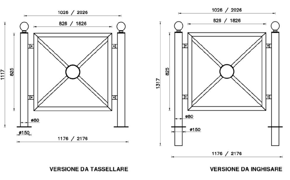 Barriera con croce di Sant’Andrea con foro centrale aperto e supporti con sfera decorativa sovrastante il supporto. Posizionata assieme al modulo base permette una protezione continua senza spazi vuoti a delimitazioni di marciapiedi, parchetti, parchi gioco…