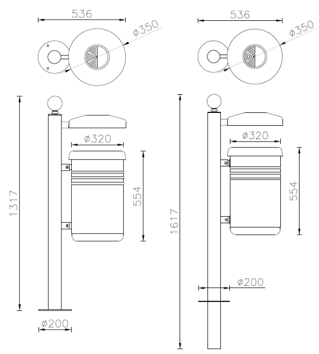 Cestino Frank composto da contenitore a forma cilindrica zincato e verniciato con polveri poliestere termoindurenti nelle diverse colorazioni RAL. L’anello superiore apribile e incernierato da un lato, con la funzione di reggisacco e foro di riduzione, per togliere il sacchetto, bisogna svitare leggermente la vite e far ruotare il contenitore di 45°. Il contenitore è fissato al palo in tubolare di acciaio, chiusa superiormente come ornamento da una sfera in acciaio, e può essere fornito con supporto da inghisare o da tassellare a terra tramite tasselli. (non forniti) È dotato di coperchio completo di posacenere. La viteria è in acciaio inox.