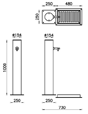 Fontana Inox costituita da una struttura in tubolare d’acciaio inox tondo, chiusa nella parte superiore da un tappo in acciaio fissato con due viti per poter essere rimosso con facilità per le operazioni di installazione e manutenzione del rubinetto. Alla base è saldata una piastra quadrata predisposta con 4 fori per poter fissare la struttura al suolo con tasselli ad espansione. Tutte le parti in acciaio inox sono con finitura sabbiata elettrolucidata. Il rubinetto in ottone nichelato è disposto di un pulsante frontale con molla di ritorno. Normalmente chiusa, è collegata alla tubazione in acciaio inox tramite un terminale filettato da 1/2″ per l’allacciamento alla rete idrica. La caditoia, realizzata interamente in ghisa verniciata, è composta da un telaio da fissare al suolo o alla sommità di un sifone per la raccolta dell’acqua, e da una griglia rimovibile che permette una pulizia agevolata.