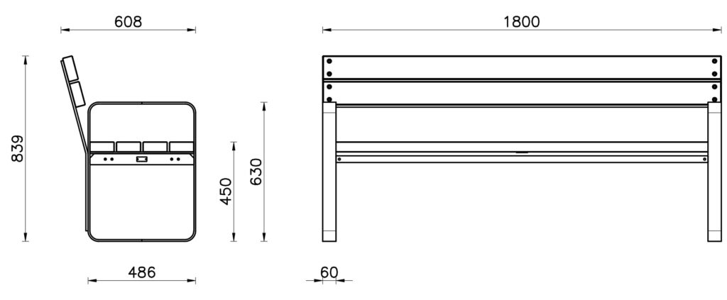 Panchina con schienale, con o senza braccioli. Struttura in acciaio zincato e verniciato, seduta e schienale in legno.
